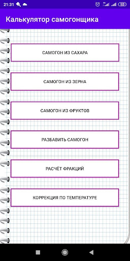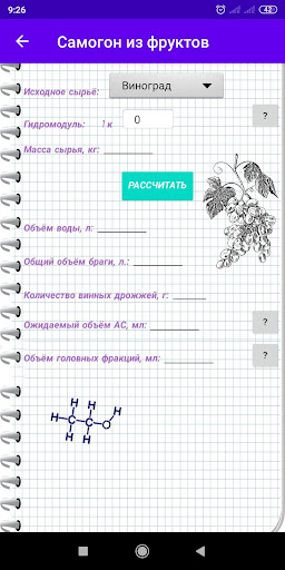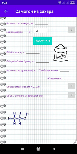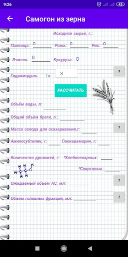 L'applicazione è una calcolatrice con cui è possibile calcolare la quantità richiesta di materie prime, acqua e lievito per la fabbricazione di un Moonshine.