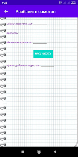 Anche c'è una "diluizione di una Moonshine", che ti aiuterà a calcolare la quantità d'acqua necessaria per aggiungere per diluire l'alcol in un certo grado.