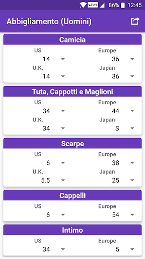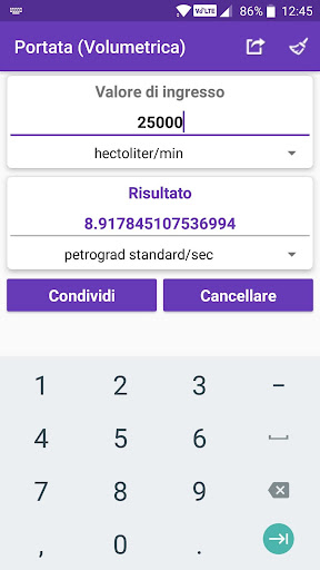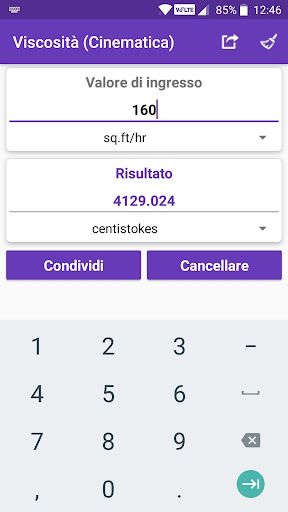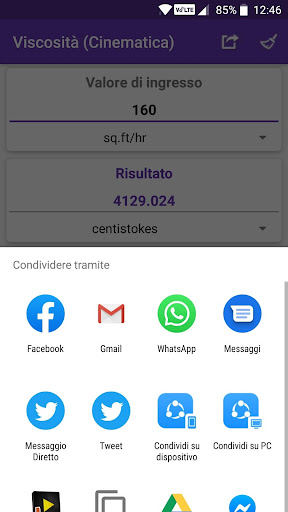 • Valori e risultati calcolati possono essere condivisi con social media, posta, messaggi e altre app di condivisione.