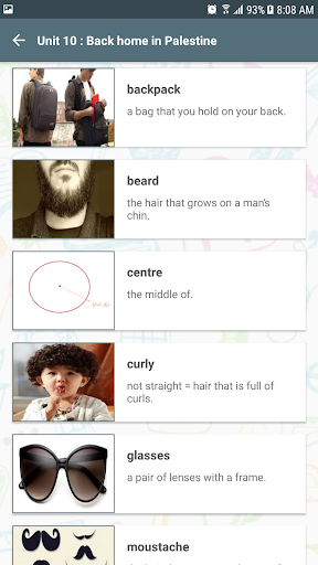 The application includes images and the correct pronunciation and meaning for hundreds of English words that represent all the words of modern Palestinian curriculum textbooks from the eighth-grade season 2.
