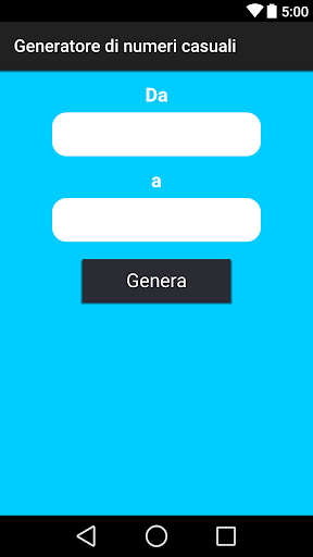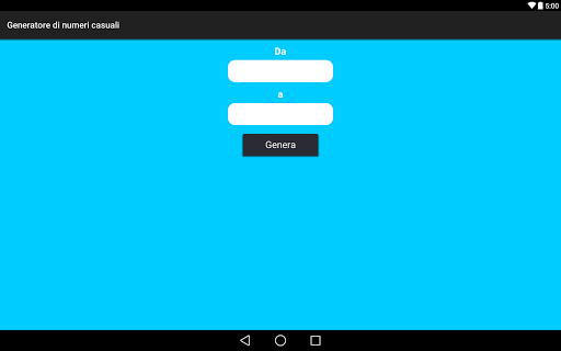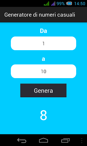 Generatore di numeri è l'applicazione che consente di ottenere numeri casuali, è possibile modificare il numero minimo e quello massimo entro i quali si potrà effettuare l'estrazione.