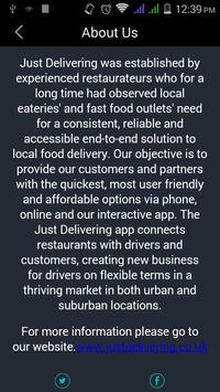 Just Delivering was established by experienced restaurateurs who for a long time had observed local eateries' and fast food outlets' need for a consistent, reliable and accessible end-to-end solution to local food delivery. Our objective is to provide our customers and partners with the quickest, most user friendly and affordable options via phone, online and our interactive app. The Just Delivering app connects restaurants with drivers and customers, creating new business for drivers on flexible terms in a thriving market in both urban and suburban locations.