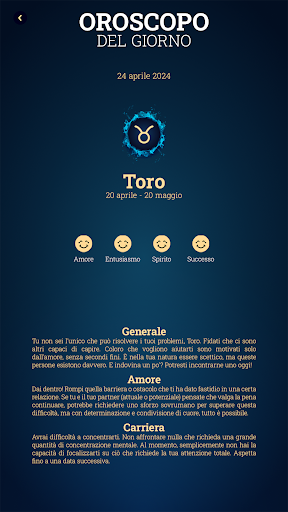 Accurata app per la “lettura dei tarocchi gratis” italiani del futuro e del presente – una guida per tutti i tuoi dubbi è qui.Consulta i nostri compatibilità segni zodiacali OGGI e predice il tuo DOMANI. L' oroscopo del giorno e lettura carte gratis prediranno con precisione il tuo futuro, indipendentemente dal fatto che tu sia un principiante o un esperto praticante di divinazione. Indipendentemente dai oroscopo 2023 e segni zodiacali che controlli, otterrai risultati veritieri. Il modo più semplice e veloce per ottenere una risposta carte dei tarocchi si o no a qualsiasi tua domanda. È la migliore “lettura delle carte gratis” in quanto è seguita dal significato e dai consigli diretti. Le interpretazioni dei oroscopo e tarocchi significato delle lettura di carte gratis ti offriranno spunti sul tuo futuro, amore e carriera. Inoltre, i significato dei tarocchi del giorno gratuiti interpreteranno la tua personalità e forniranno consigli sugli ostacoli sul tuo cammino. Crea la tua “tema natale astrologia” completa. Cosa dicono di te le stelle? Questa “astrologia tema natale italiano” risolve tutti i tuoi dubbi. La sua app per astrologia e oroscopo amore ti porteranno al successo. Scarica Astrologia Oroscopo e Tarocchi Carte.