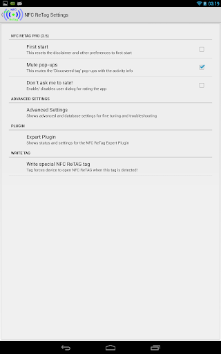 Puoi utilizzare questa app per associare più funzioni (ad esempio WLAN OFF, Bluetooth On , Avvio dei dati mobili, avviare la navigazione, Avviare l'attività del Tasker, avviare qualsiasi app installata, utilizzare i pulsanti multimediali, chiamare un numero di telefono, aggiungere un timestamp, voce del calendario, aggiungere il testo-parlato e molto altro ancora!) A un NFC (campo vicino Comunicazione) Tag tramite un database interno dell'app. Puoi persino aggiungere cicli da tag e lasciare che il tuo tag funzioni diverse per scansione. Quindi Retag è il perfetto strumento di automazione NFC per te ;-).