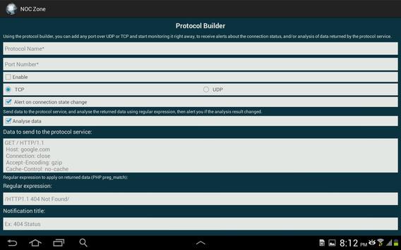 NOC Zone can handle monitoring any type of protocol. Using NOC Zone protocol builder you can add any port over UDP and TCP and NOC Zone will analyze the received data, as well as receive notification and reports regarding the built protocol (custom protocol).