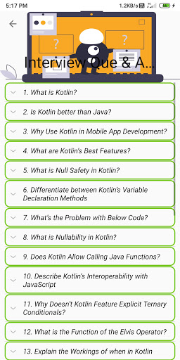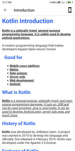 Imparare liberamente la lingua di Kotlin ovunque.Così facile da imparare, hanno domande di base, avanzate, interviste, molti programmi e codifica online.