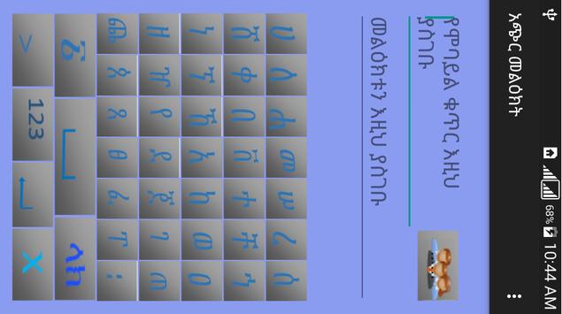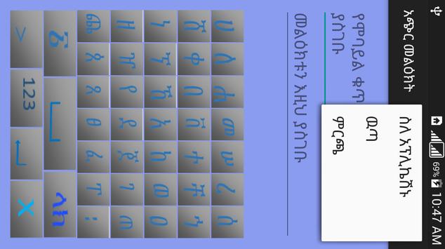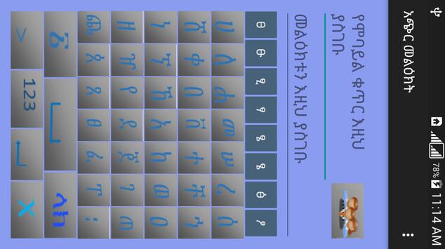 It is designed to be simple messaging application for android smart phones since most keyboards are difficult to use or are not functioning in the most common devices used in Addis Ababa. It is a nice opportunity for users commonly challenged with English language.