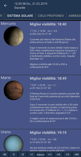 Mobile Observatory non include solo una mappa del cielo, che si può zoomare, che ti dice in tempo reale quale oggetto del cielo stai guardando, ma ti fornisce tantissime informazioni dettagliate aggiuntive su stelle, pianeti, oggetti del cielo, meteoriti, comete, asteroidi, eclissi lunari e solari ed effemeridi dettagliati di tutti gli oggetti celesti inclusi e una vista dall'alto e interattiva del Sistema Solare. Tutto ciò in un'unica app!