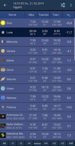 - Effemeridi dettagliati, informazioni sulla visibilità di tutti gli oggetti
