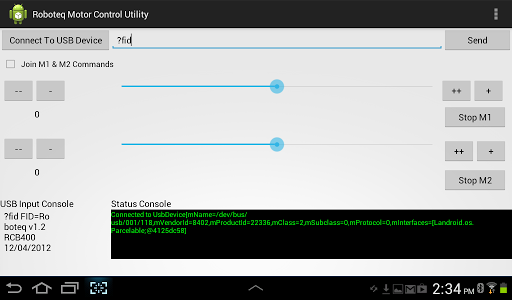 This is an Android powered motor control utility for the RoboteQ MDC2250C motor controller. Connect your Android device to the MDC2250C USB port. Provides a subset of features found in the RoboRun Utility including: