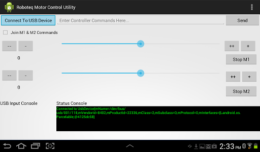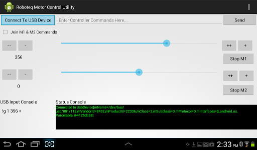 7. USB Input Console will display reply messages from the RoboteQ MDC2250C motor controller