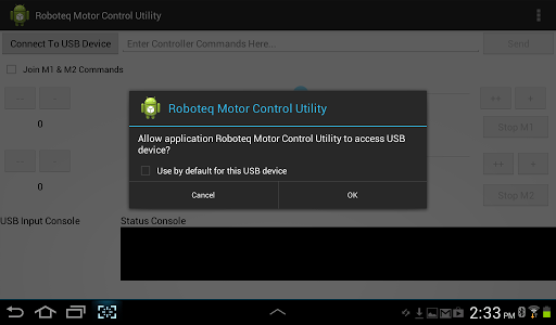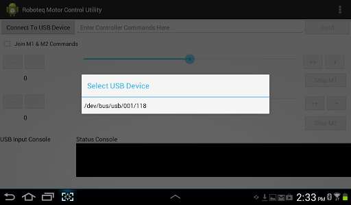 1. Connect USB cable from Android device to RoboteQ MDC2250C motor controller USB port