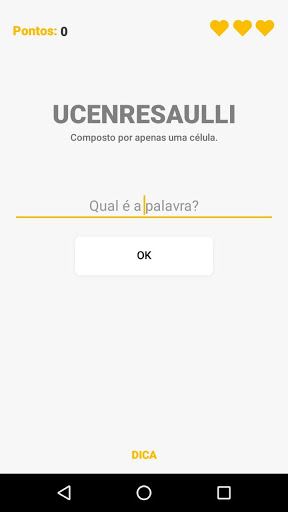 Palavras aleatórias de biologia irão aparecer na tela totalmente embaralhadas e logo abaixo, seu significado. Seu objetivo é escrever qual é a palavra.