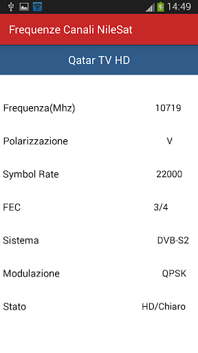 • Informazioni dettagliate per ciascun canale (frequenza - Polarizzazione -. Stato SAR -FEC -Modulation -Sistema -Channel (SD o HD / crittografata o trasparente))