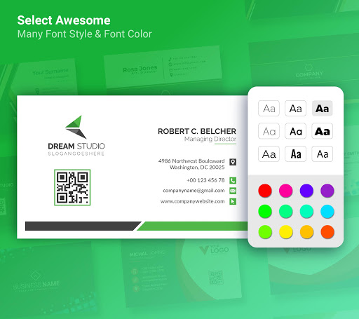 Free Visiting card maker app has 75 creative designs. The graphic designs made with business card designer looks like visiting card created by professional graphic designer.