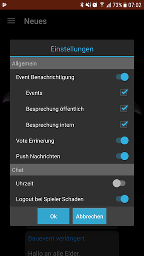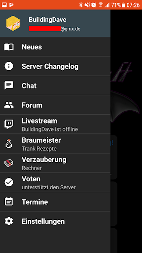 Bei aufrufen der App bekommt man die letzten 5 Neuigkeiten unseres Forums angezeigt. Im Umfang ist ein Chat für Minecraft zum direkten chatten auf einem Minecraftserver enthalten. Hier meldet man sich mit seinen Accountdaten von Minecraft an. Auch kann man den LiveStream betreten, voten oder sich direkt zum Forum weiterleiten lassen.