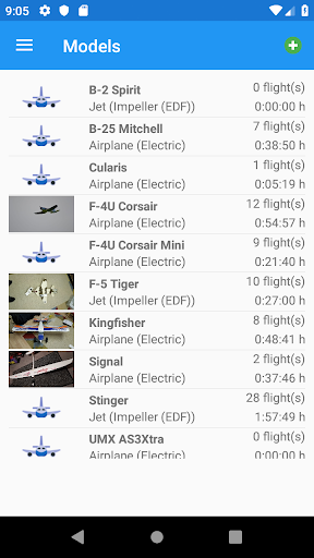 These three databases will then be used for saving your model flying activities and necessary information will be suggested fitting other information already provided (e.g. for a specific airplane only batteries fitting to its engine will be suggested - their charge status is also taken into account).