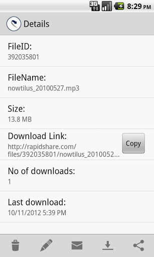 This App was made by a group of Official RapidShare Reseller. You can upload files from your device and download your files to your device.Keep your files always with you. Just one click away.Downloaded files are stored on your mobile and redownload is not neccessary. The app will track your downloads.To download the file again, just delete it from your device.You can:- browse your files, folders- download and upload files- view file details- view account information - share your files
