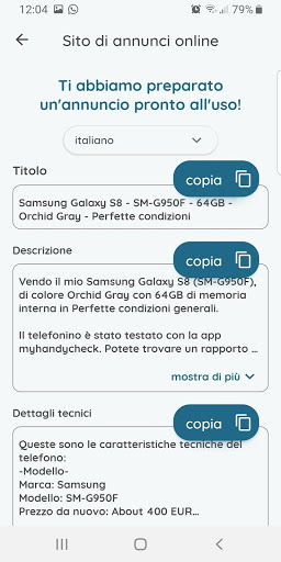Oltre al rapporto dei test, creiamo un annuncio che contiene tutti i dati del tuo telefono, cosí non devi ricordare il modello, la capacità della memoria o qualsiasi altra caratteristica interessante per un potenziale compratore. Dovrai semplicemente condividere l'annuncio con le tue app di messaggistica o copiare ed incollare il testo nelle tue reti sociali o siti di annunci preferiti. Il rapporto dei test dimostrerà in che condizioni è il tuo telefono, generando fiducia e permettendoti di venderlo ad un prezzo migliore.