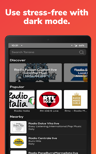 Tarana Radio Italia ti offre la migliore esperienza quando si tratta di ascoltare la radio FM e la radio diretta online. L'app radio Tarana è la migliore app radio che ti porta le radio online in diretta in quasi tutte le stazioni radio americane. Sintonizzati sul flusso diretto della tua stazione radio preferita ovunque tu voglia e quando vuoi.
