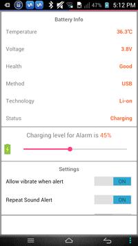 Battery Charging alarm is a small, smart, sleek and very useful elegant app that will help you follow the current battery percentage on your Android device, and even serve as a battery saver.