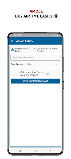 Questo etel 630 Incorpora denaro digitale oltre alla carta mobile basata su carta.Per abilitare questo abbiamo integrato con Dashen Bank Amole .Questa integrazione offre agli utenti delle nostre app l'opportunità di utilizzare i servizi AMole all'interno della nostra app..;>