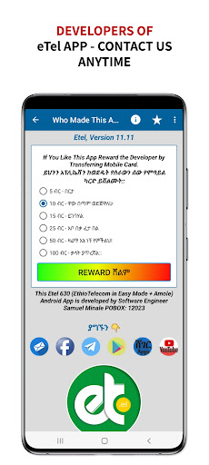 ይህ etel 630 የተሰኘ መተግበሪያ መተግበሪያውስጥ ለመጀመሪያ ጊዜ ፈርቀዳጅ በመሆን በካሜራ በመጠቀም የሞባይል ካርድ ማንበቢያን የፈጠራ ስራን ሰርቶ ያስተዋወቀ መሆኑ ይታወቃል (ይህም በኢትዮጵያ አእምሯዊ ንብረት ንብረት/ቤት ተመዝግቦ ይገኛል) አሁን ደግሞ ደንበኞቻችን በወረቀት ካርድ ሳይሆን በዲጂታል ገንዘብም ተጠቅመው ተጠቅመው ካርዳቸውን እንዲሞሉ እንዲሁም ከስር የተዘረዘሩትን ተግባሮች መፈፀም እንዲችሉ ከዳሽን ከዳሽንአሞሌ የዲጂታል ገንዘብ ጋር በመተባበር ስማችንንም ከ & quot;Telecom etiope in modalità facile ኢትዮ ቴሎኮምን በቀላሉ & quot;ለመያዝ ቀለል ወደ ሚለው ወደ & quot; etel 630 & quot;ቀይረን ከትልቅ አፕዴት ጋር መተናል። etel 630 ለ ኢትዮጵያ ቴሌኮሙኒኬሽን (ኢትዮ ቴሌኮም) ደንበኞች የሚሆን ከሲም ካርድ ጋር የተያያዙ አገልግሎቶችን ከአሞሌ ጋር አስተባብሮ የያዘ አፕሊኬሽን ሲሆን ከያዛቸው አገልግሎቶች