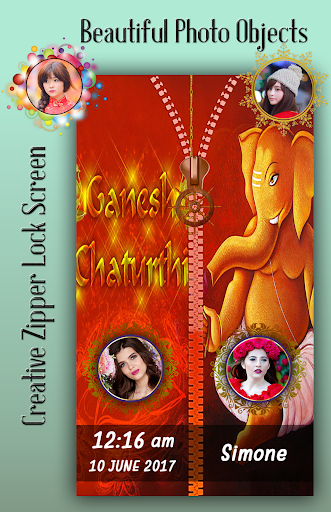 ganesh chaturthi is made and used as a decoration. ganesh chaturthi shines by reflection with many small flashes of brilliant light or to shine with strong emotion to be brilliantly attractive. It is a free zipper lock app for your quality android device. If you love the ganesh chaturthi shine, then you surely want to decorate your home screen with ganesh chaturthi zipper Lock Screen. Young girls and guys will really like it.