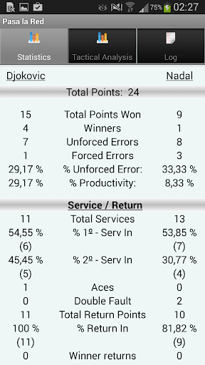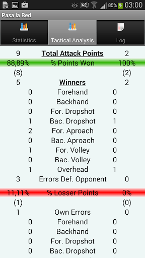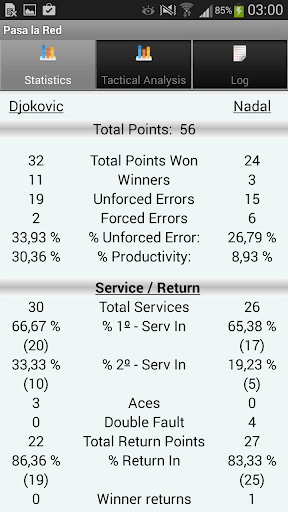 This application allows us to collect the information of a tennis match. All points played in a game are recorded to obtain an objective statistical information "Stadistics". But the most important and innovative is the final tactical report "Tactical Analysis". This allows us to focus more effectively the training of our players.
