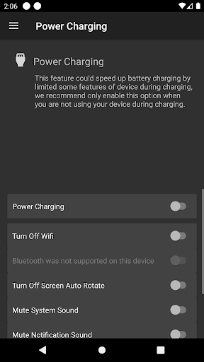 Questa funzione potrebbe accelerare la carica della batteria da parte di alcune caratteristiche del dispositivo durante la ricarica, come lo spegnimento Wifi. Si consiglia solo abilitare questa opzione quando non si utilizza il dispositivo durante la ricarica. L'utente potrebbe scegliere in quale opzione applicare durante la ricarica.