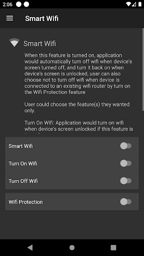 Quando questa impresa URE è acceso, l'applicazione spegnerebbe automaticamente WiFi quando lo schermo del dispositivo è stato disattivato e riaccenderlo quando viene sbloccato la schermata del dispositivo, l'utente potrebbe scegliere di attivare o disattivare solo WiFi.