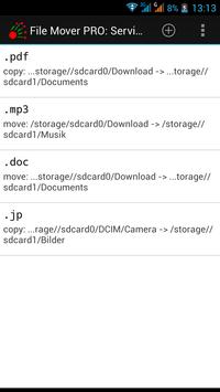 For example, .MP3 files from /sdcard/download to /sdcard/music. And .PDF Files from /sdcard/external_sd/office to /sdcard/Documents...