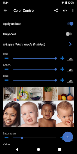 Controlli RGB, saturazione, valore, contrasto, tonalità e k-lapse. Salva, carica e condividi profili personalizzati. (Richiede il supporto del kernel)