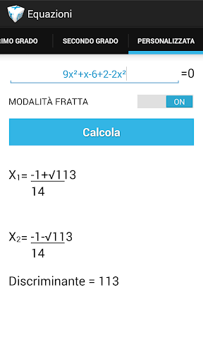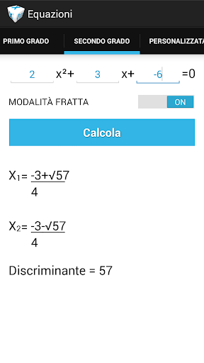 - 2 modalità di risoluzione, modalità decimale, che calcola semplicemente i risultati decimali, e modalità fratta, la quale calcola i risultati apportando semplificazioni in modo da non ottenere risultati decimali.