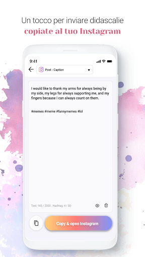 Quando posti foto e video, il tuo cervello diventa vuoto e non ti vengono ispirazioni? Mai più! GetinsCap vi aiuterà a trovare didascalie accattivanti e vi darà la corrispondenza perfetta. Con oltre 30 categorie, offre tonnellate di didascalie per Instagram. Non importa che contenuto posti, troverai sempre il più adatto. Oltretutto può salvare i tuoi lavori creati per un utilizzo futuro.