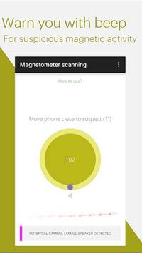 Hidden Camera Detector will let you know if there is a hidden device or a hidden camera in your surroundings, You just have to move the phone with app opened in it. It will beep if there is any potential hidden camera around. This hidden camera detector detects camera and Microphone as well, and will let you find any camera that spys on you.