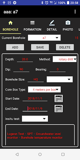 include borehole no., borehole depth, borehole method, core size, borehole orientation, and testing items.