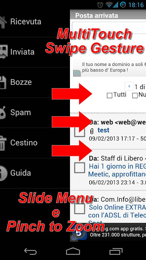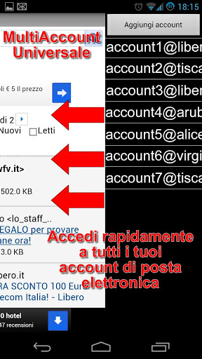 iMail è un client di posta elettronica con accesso multiaccount e sistema avanzato di notifiche. Con iMail puoi accedere in modo rapido, efficiente e libero a qualsiasi provider mail per leggere la tua posta elettronica, inoltre puoi registrare più account mail di uno stesso servizio. Solo iMail ti offre un potente servizio di gestione mail, con funzioni avanzate (SwipeMenu, ZoomMail, Multiaccount, Notifiche) e con un'interfaccia touch ottimizzata per Smartphone e Tablet.☞ Informazioni: ☜1) L'app iMail è un client mail con accesso a tutti i tipi di posta elettronica2) L'app non è un'app ufficiale e non è legata in alcun modo a servizi come: Aruba mail, Tiscali mail, Libero mail, Alice mail, Virgilio mail, Tele2 mail, Tin mail, ecc...3) L'app non è differente da client di posta elettronica come K9-Mail e Aqua Mail e come quest ultimi offre un servizio libero per l'accesso universale a tutti i provider mail4) Le notifiche sono elaborate utilizzando un modulo simile a "K9", pertanto sono molto leggere da gestire➜ ATTENZIONE: Per tutti quelli che scrivono recensioni NON veritiere sul funzionamento dell'app. Ogni giorno quest'ultima viene testata da altri utenti (come voi), che verificano l'app in tutti i suoi aspetti, pertanto vi invitiamo a contattarci tramite email prima di lasciare una recensione sul market! ... e ricordate che l'app è gratuita!☞ Funzioni avanzate: ✪✓Multiaccount universale✓Notifiche di ricezione mail✓Multi-Touch Swipe Gestures✓Grafica ottimizzata per Smartphone e Tablet✓Velocità di navigazione ottimizzata per 3G e wifi ✓Download/upload allegatiL'App NON raccoglie nessuna informazione personale, quali password, username, ecc... Il developer non è associato in alcun modo ai fornitori dei servizi di posta.imail, mail, email, webmail, best