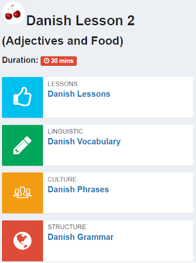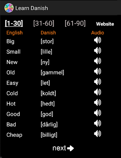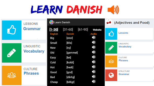 The following Danish words are designed to help you improve your speaking, reading, and writing. Each lesson offers vocabulary components such as: travel words, food, animal names, languages, directions, people, survival, colors, weather, places, and shopping ... etc. We also added grammar tips to include: adjectives, plural, prepositions, feminine, numbers, negation, pronouns, questions, determiners, nouns, verbs, adverbs ... etc.