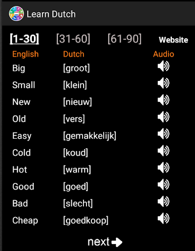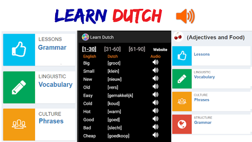 The following Dutch words are designed to help you improve your speaking, reading, and writing. Each lesson offers vocabulary components such as: travel words, food, animal names, languages, directions, people, survival, colors, weather, places, and shopping ... etc. We also added grammar tips to include: adjectives, plural, prepositions, feminine, numbers, negation, pronouns, questions, determiners, nouns, verbs, adverbs ... etc.