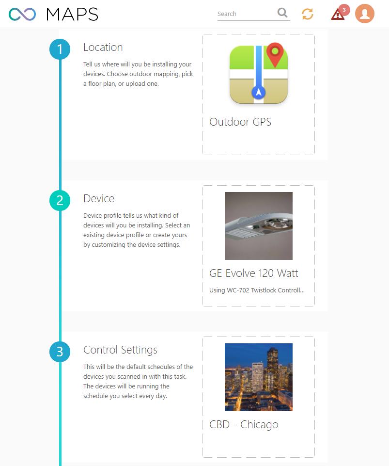 SET, SCAN, GO, creates installation tasks by selecting device types, smart control profiles for the street types or areas where equipment is installed.