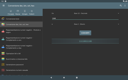 Conversione byte - Conversione dec, bin, oct, hex - Rappresentazione numeri negativi: Modulo e segno, Complemento a uno, Complemento a due - Operazioni bit a bit - Scorrimento e rotazione bits - Generazione password - Generazione numero casuale - Codifica / decodifica Base 64 - Codifica / decodifica URL - Generazione hash MD5, SHA, CRC-32 - Conversione Timestamp Unix - Calcolo POE - Calcolo subnet - Tempo di trasferimento dati - Wake On Lan - Conversione RGB/Esadecimale