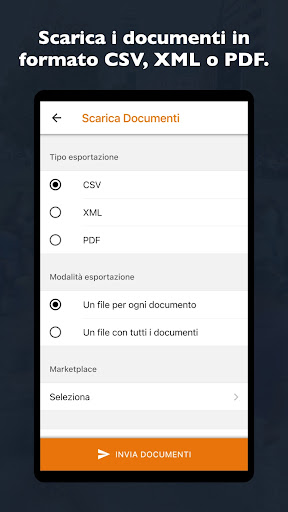 - Download Documenti: scarica i tuoi documenti in formato XML o CSV. Importali nel tuo gestionale ed invia le fatture elettroniche entro 12 giorni.