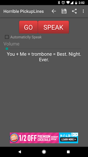 Create some awful pickup lines! Using the power of randomness create some pickup lines that are NOT guaranteed to Ever work! This app works like automatic madlibs using a complex algorithm to create truly hysterical pickup lines.