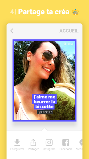 Un nouveau mode d’expression, sans limite. Lokus est la première plateforme permettant de créer des visuels à partir de citations. Prend une photo, choisis une citation, et crée un montage avec ! Différents styles, typos, filtres etc… te permettent de créer des visuels uniques et funs.