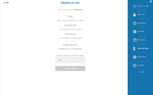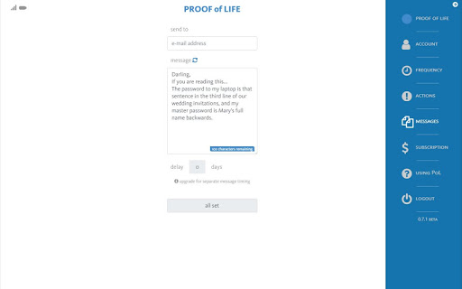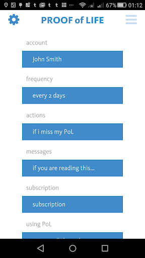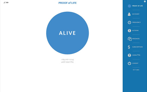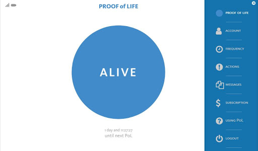 My Proof of Life is an application that safely keeps a set of instructions or even a message, to be delivered to someone of trust in case some accident, or unforeseen impairing health issue happens.