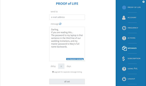 Subscribing to My Proof of Life now, the danger of total loss regarding your critical data can be zero in 5 minutes.