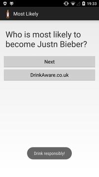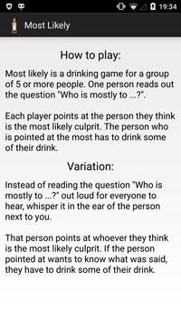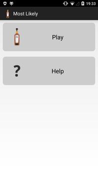 Most Likely is a drinking game where a statement is read and all the player point at the person they think best fits the statement. The person that gets pointed at the most has to drink.