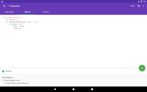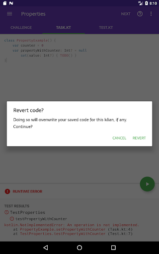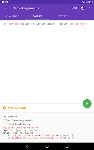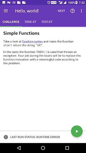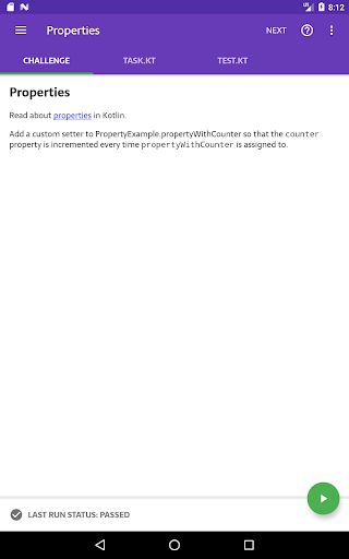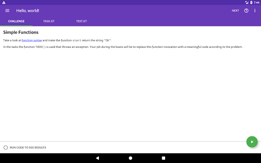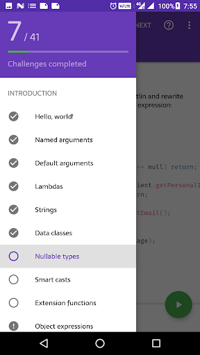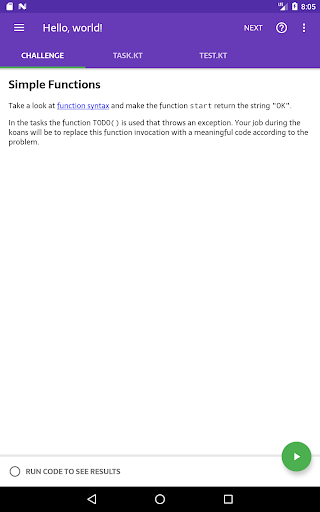 Kotlin Kōans ti consente di imparare la programmazione di Kotlin nelle sessioni di 5 minuti di dimensioni morsi. Come sviluppatore Android, potresti avere un programma impegnato e non avere abbastanza tempo per imparare un linguaggio completamente nuovo sul lato. Se sei in quella situazione, Kotlin Kōrans è qui per aiutare - risolvere solo 1 o 2 sfide ogni volta che ricevi qualche minuto, e in poche settimane avrai una buona comprensione dei fondamentali di Kotlin.