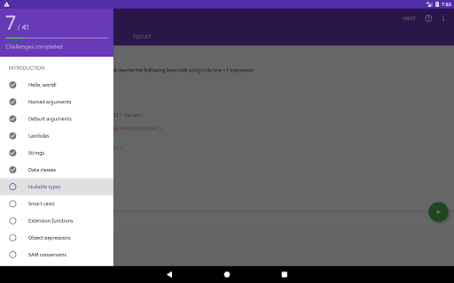 Report Bugs e propongono nuove funzionalità: https://github.com/vickychijwani/kotlin-koans-android/issues